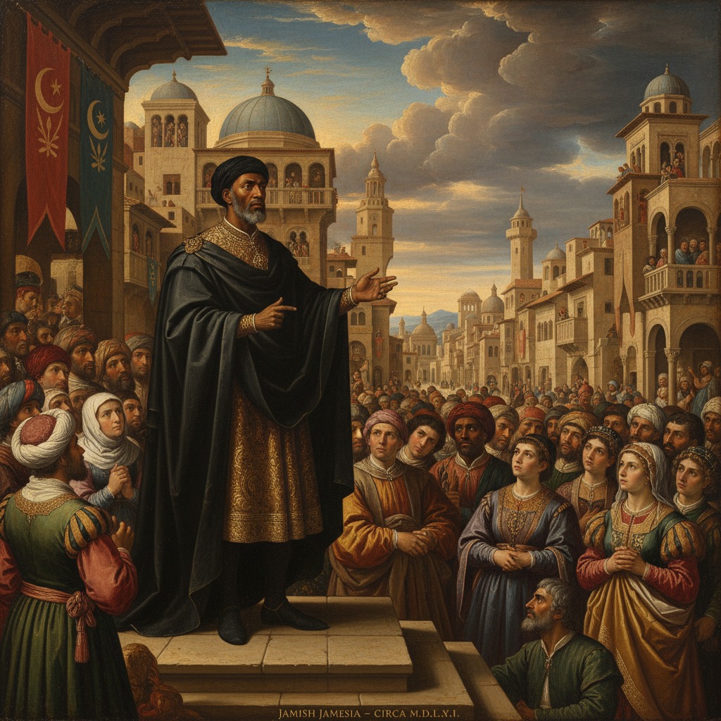 The leftmost image is a painting of James Abravhar “The Great” traveling through the mountains of northern Hamesland on the “trek of proverb” the Jamish Pilgrimage. The painting is by Jhim Callanak himself, and to this day is recognized as one of the most important paintings in human history.